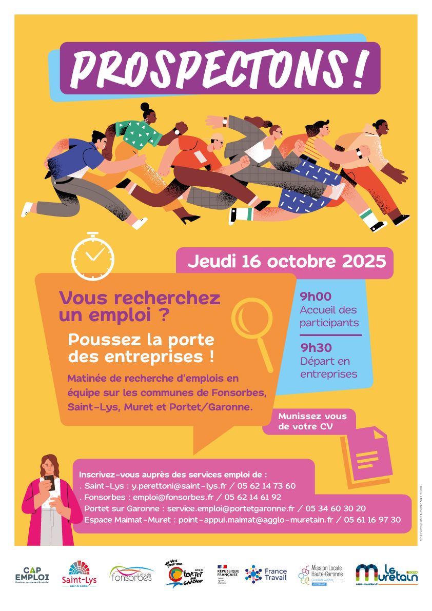 La prochaine édition du « Prospectons » se tiendra le 16 octobre 2025. Cette matinée de recherche d’emplois en équipe se déroulera sur les communes de Fonsorbes-Saint-Lys, Muret et Portet/Garonne.