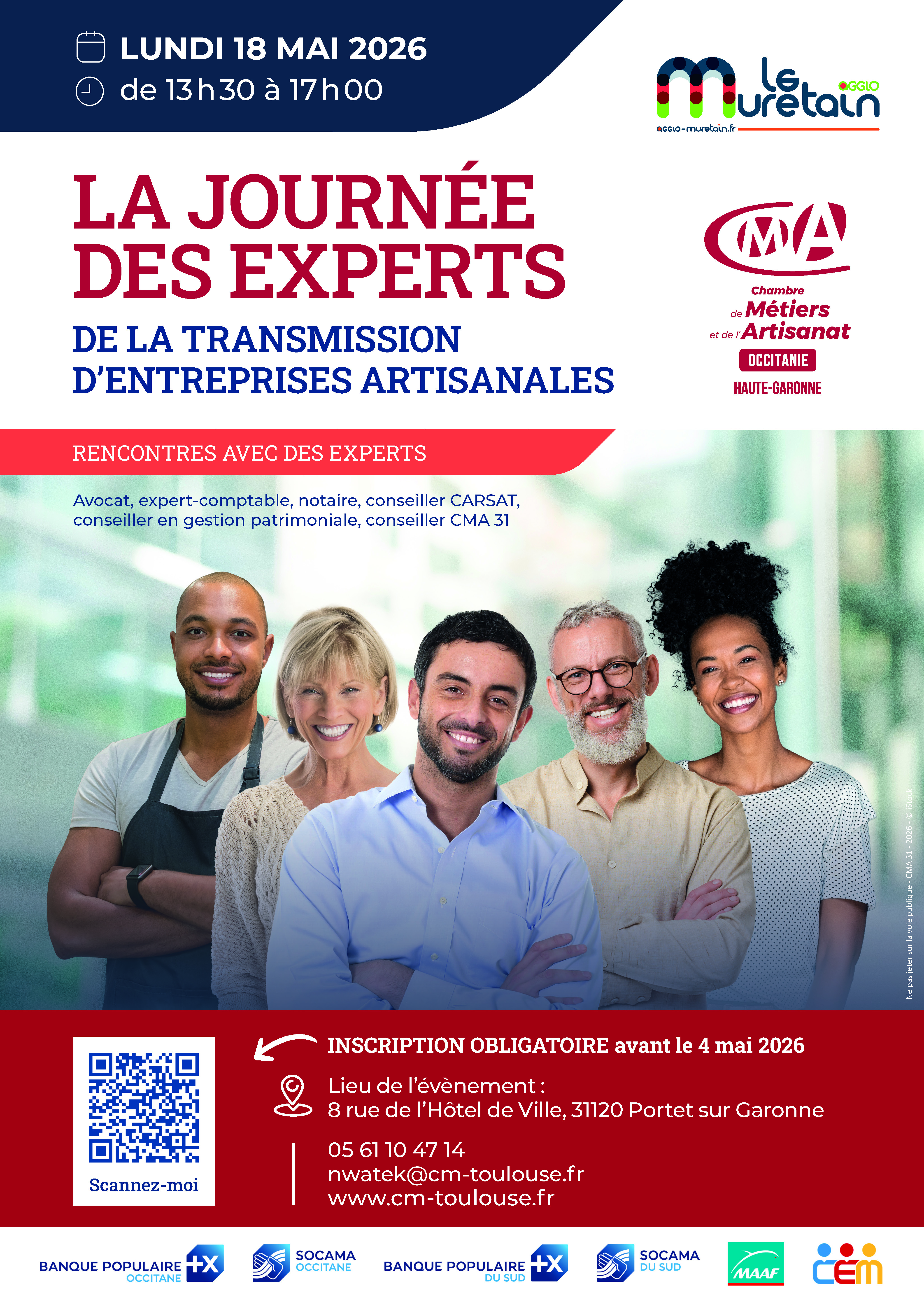 Pour aider les artisans à préparer au mieux ce projet, la Chambre de Métiers et de l’Artisanat Région Occitanie/ Pyrénées-Méditerranée - CMA de Haute-Garonne et le Muretain Agglo, invitent les chefs d’entreprise à la Journée des experts de la transmission d’entreprises :